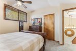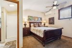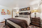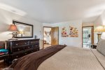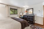 Downstairs is the master bedroom with King bed and full bathroom. The ground level deck also overlooks the Whitefish River. A cozy sitting area features another smart TV and a desk for a work area.
